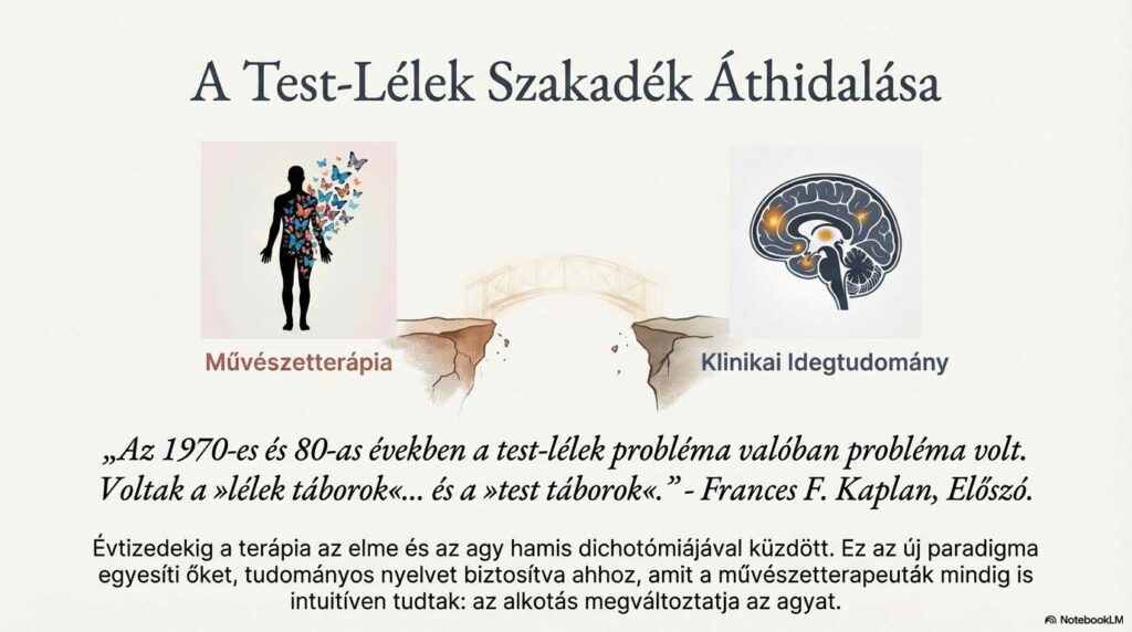 A könyv átfogó áttekintést nyújt a művészetterápia és a klinikai idegtudomány metszéspontjáról. Hangsúlyozza az elme-test kapcsolatot és az integrált perspektíva felé való elmozdulást, gyakran az interperszonális neurobiológia szemszögéből. Részletezi, hogy az olyan agyterületek, mint az amygdala (félelem) és a prefrontális kéreg (szabályozás), hogyan reagálnak a stresszre és a traumára. Központi szerepet kap, hogy a művészeti alkotás elősegíti a neuroplaszticitást és támogatja a biztonságos kötődés kialakulását azáltal, hogy integrálja az implicit, érzelmi emlékeket a tudatos éntörténetbe. Ezenkívül a művészetterápiás beavatkozások alkalmazását vizsgálja különféle csoportoknál, például komplex PTSD-ben szenvedő egyéneknél, pároknál és Alzheimer-kórban érintetteknél. Végül kiemeli a nemi különbségeket az agyi válaszokban és a krónikus stressz élettani hatásainak kezelését illetően. Eszerint a nők agya erősebb integrációt mutat a nyelvi és érzelmi területek között, ami elősegíti az érzelmek verbalizálását és a multitaskingot; addig a férfiak agya specializáltabb és lateralizáltabb, ami a térbeli képességekben, a célközpontú gondolkodásban és a kockázatvállalásban segíti őket.