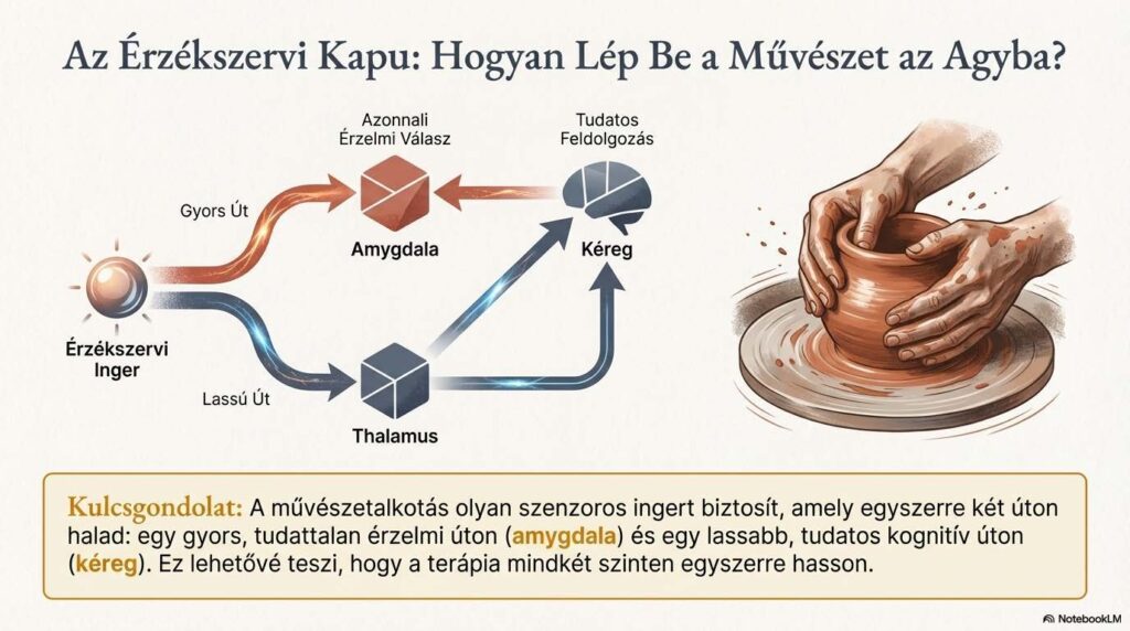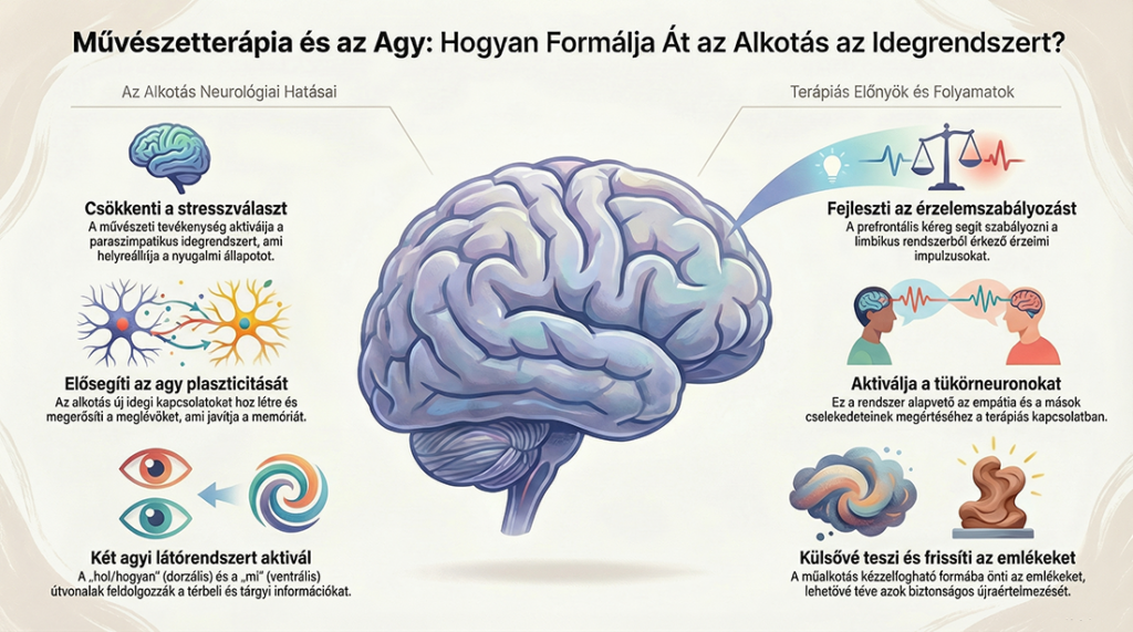 3. Neurológiai Átprogramozás: A művészeti cselekvés és a motoros aktivitás (például agyag formázása vagy rajzolás) jutalmazó idegpályákat aktivál, ami segít a negatív érzelmek pozitívvá alakításában. A biztonságos kontextusban végzett munka lehetővé teszi, hogy a traumás emlékek felelevenítésekor csökkenjen az amigdala (félelemközpont) által kiváltott félelemre adott válasz