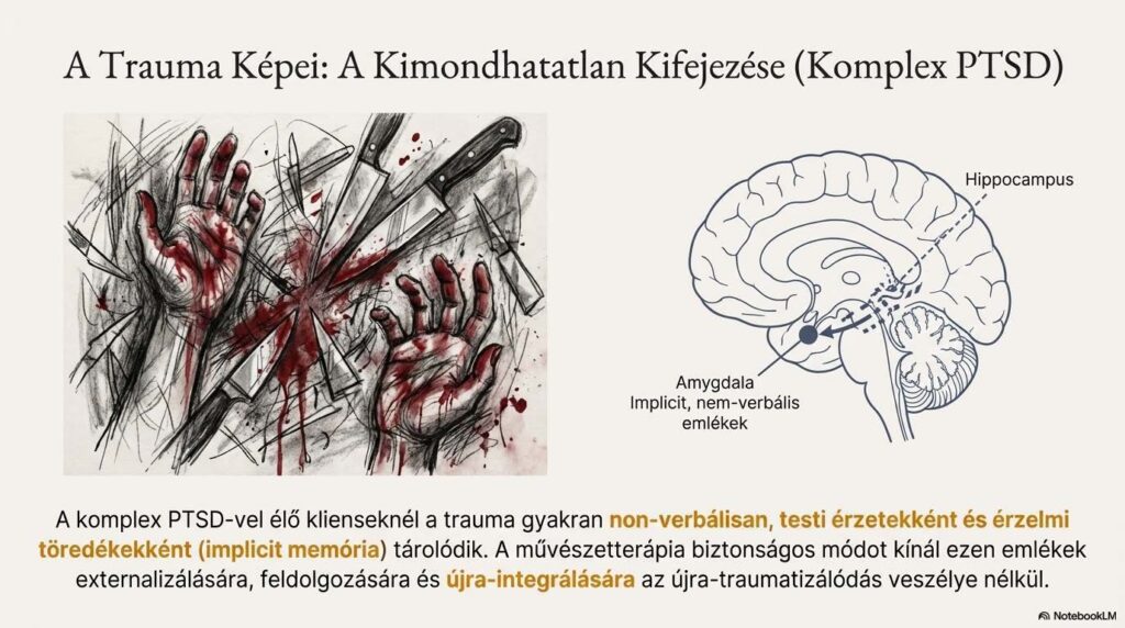 2. Érzelmi Szabályozás és Kontroll: Az alkotás fizikai távolsága és a terápiás környezet biztonságot nyújt az elsöprő érzelmek titrálására és a kontroll érzetének kialakítására. Ez elengedhetetlen a krónikus poszt-traumás stressz zavar (C-PTSD) kezeléséhez