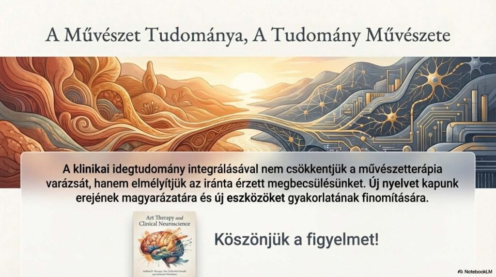 4. Integráció és Kapcsolat: A műalkotásról szóló verbális címadás és megbeszélés (verbalizáció) segíti a bal agyfélteke és a kortikális funkciók aktiválását, ami a traumás élmények koherens narratívába történő integrációját támogatja. Az empatikus rezonancia révén a terapeuta segíti a biztonságos kötődés kialakítását, ami növeli a kliens pszichológiai rugalmasságát és gyógyulási képességét.