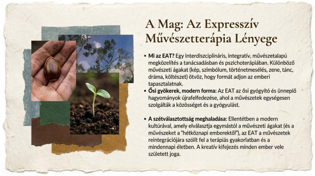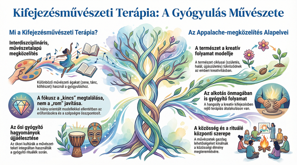 Az expresszív művészetterápia egy interdiszciplináris, integratív megközelítés, amely a különböző művészeti ágakat – mint a képzelet, szimbólumok, történetmesélés, rituálé, zene, tánc, dráma, költészet, mozgás és vizuális művészetek – kombinálja az emberi élmények formába öntése, valamint a személyes fejlődés és gyógyulás elősegítése érdekében. Bár modern terápiás területként újnak számít, ez a módszer valójában ősi gyógyító hagyományok visszavételét jelenti, ahol a művészeteket integráltan használták az élet ciklusainak ünneplésére és a közösségi gyógyításra, elválaszthatatlanul a mindennapi élettől és a spiritualitástól.
