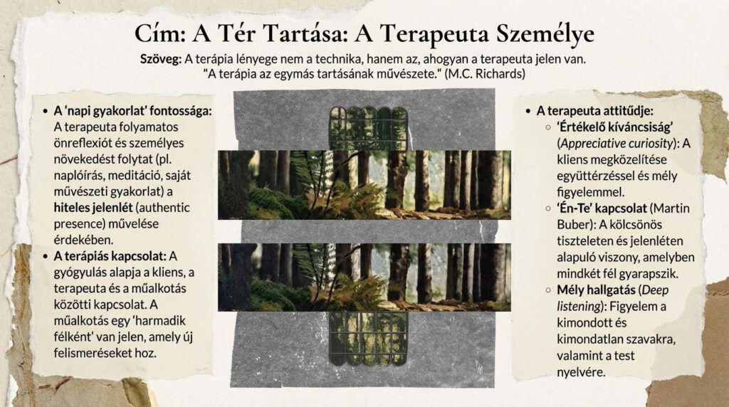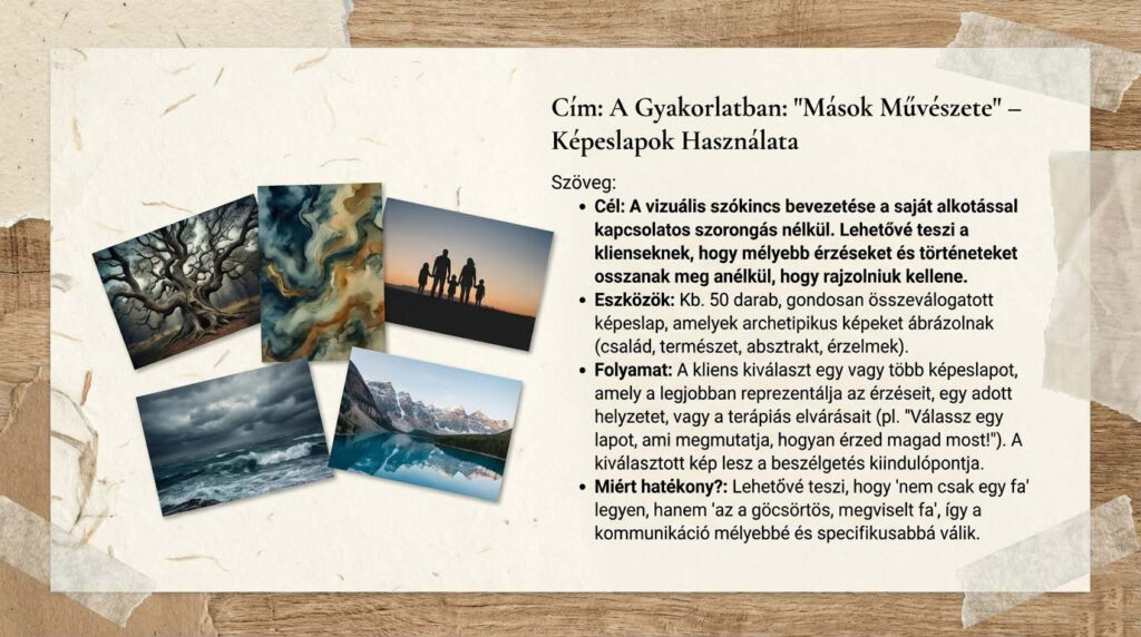 • A művészet mint orvosság (Shaun McNiff): Ez a megközelítés az imagináció terápiája, amelyben a képek gyógyító hírnökökké válhatnak, és a velük folytatott párbeszéd során tárulnak fel üzeneteik